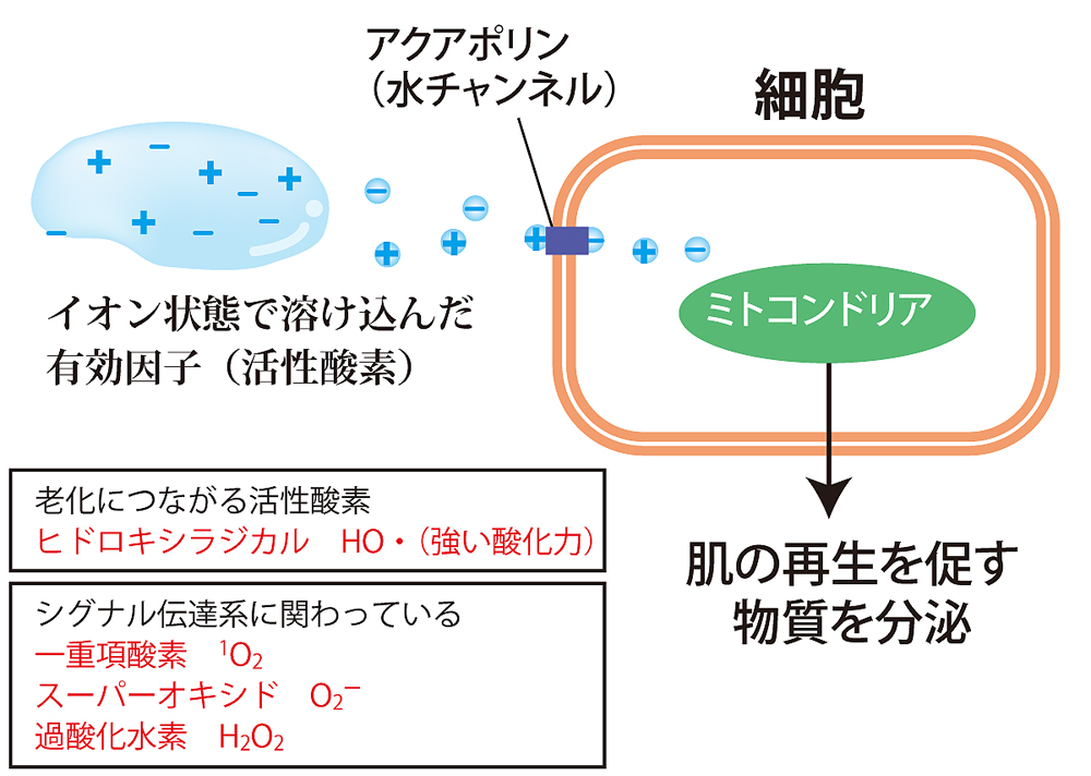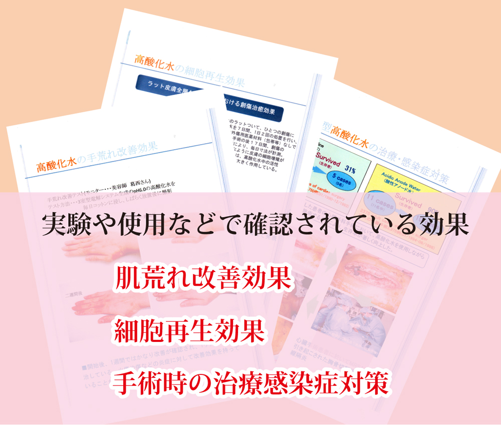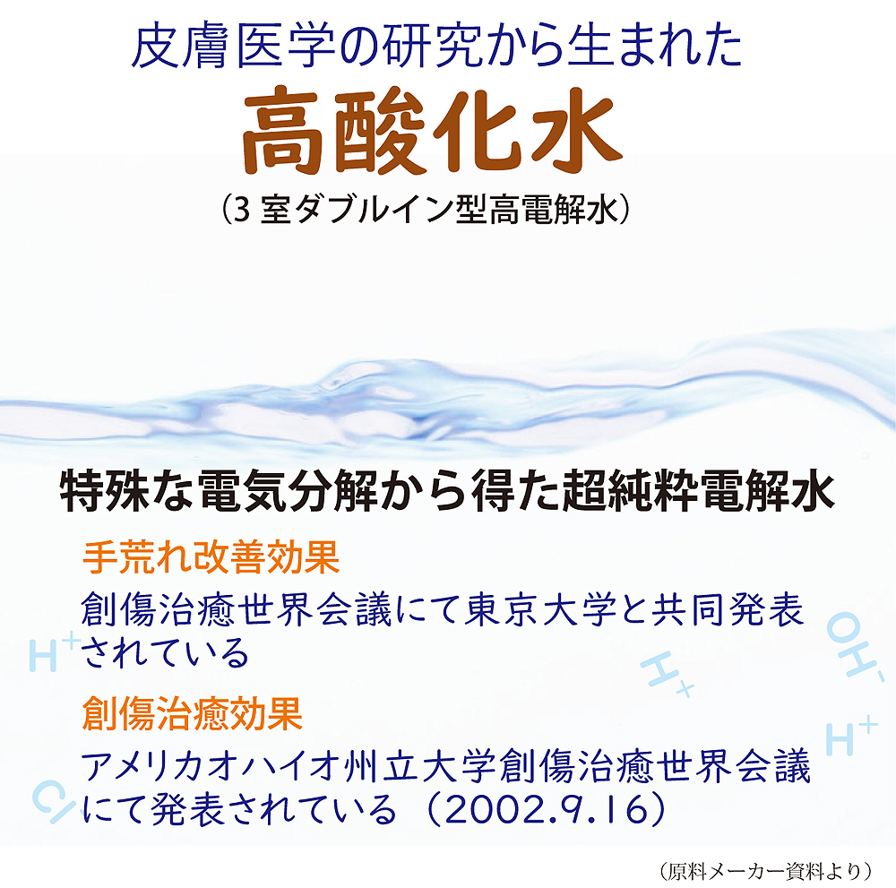 3室ダブルイン型電解システムで生成された電解水”高酸化水”は、クラスターが小さく肌に浸透し、肌水分量を高めて肌のバリア機能を高めます。また肌の再生を促す電解水として論文で発表されています。