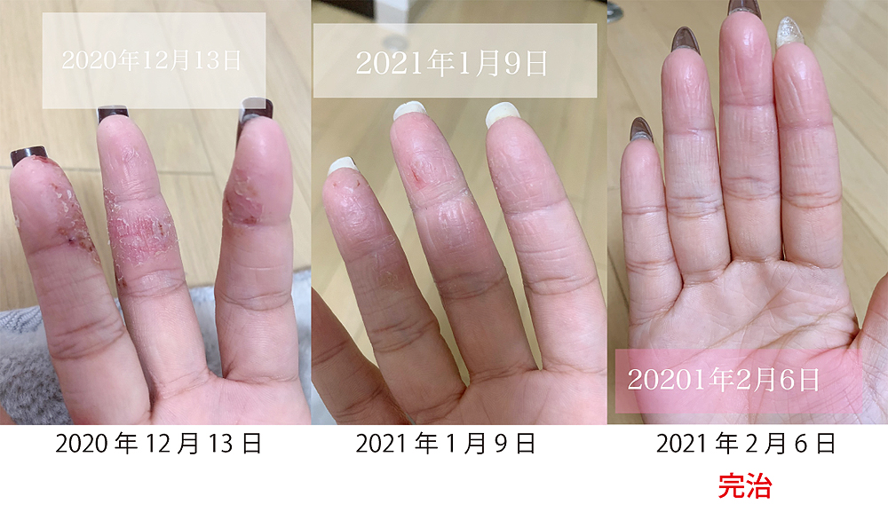 アイリスト女性24歳で、溶剤や消毒で手が荒れおり、市販のハンドクリームだけでは全然治らなかった。手洗い後、高酸化水化粧水を使用するだけで約三週間でかなり改善し、40日を超えると完全に完治しました。