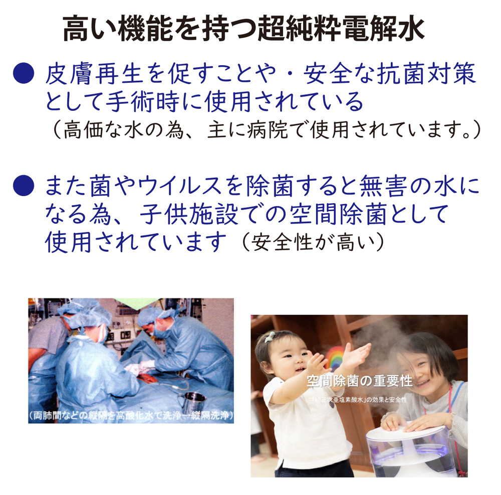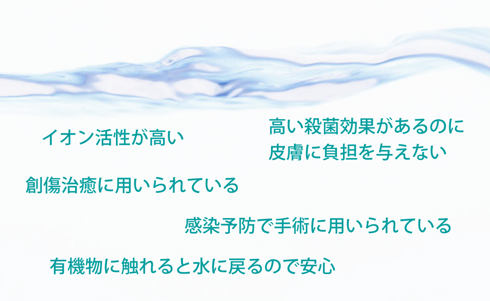 高酸化水は特許製法により、他の電解水に比べて効率が良く、食塩水等の不純物が少ない水超純水の電解水を作り出すことに成功しました。