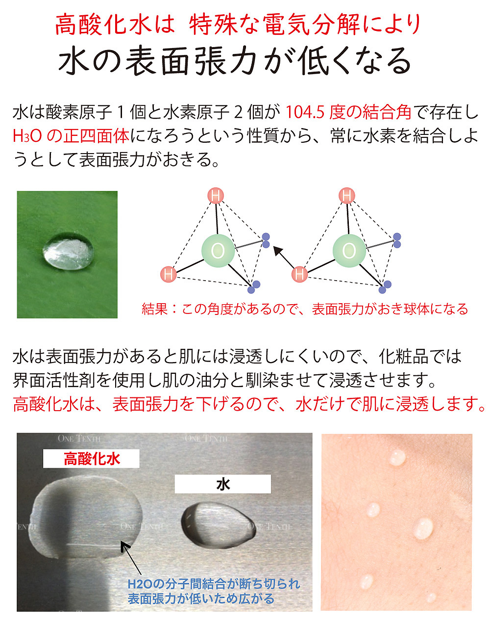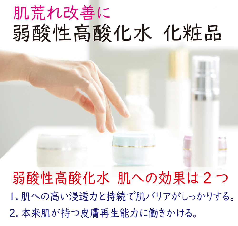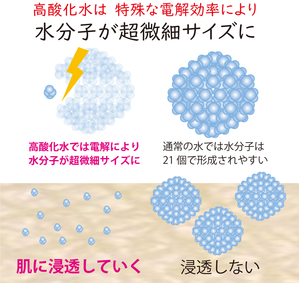 さらに高酸化水の良いのは、電解により表面張力を失くします。それによって肌(細胞)に浸透し、水分量を高め