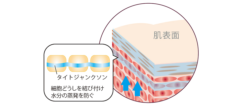 肌は水分量が高いと肌組織の結合が強まります。第2のバリアといわれるタイトジャンクションも水分量が高いと細胞間の結合をしっかりさせ強くすることができます。