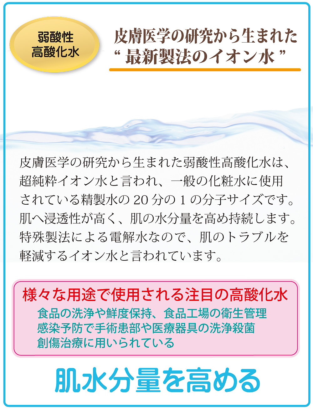 肌の水分量を高め維持する贅沢な”弱酸性高酸化水100%使用!