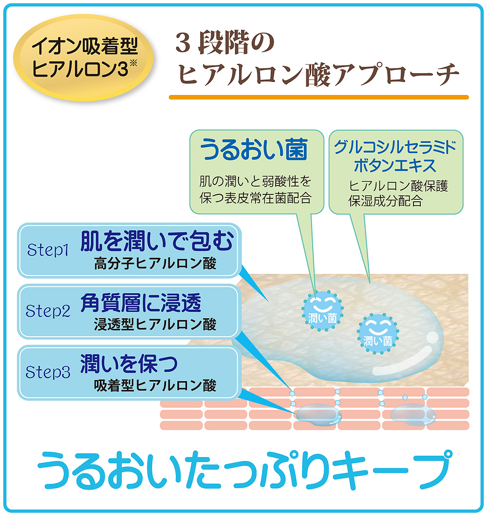 潤いを逃がさない3段階アプリーチのイオン吸着型ヒアルロン3配合と皮膚再生分野で注目の電解水”弱酸性高酸化水”を100%使用した贅沢クリームです。
