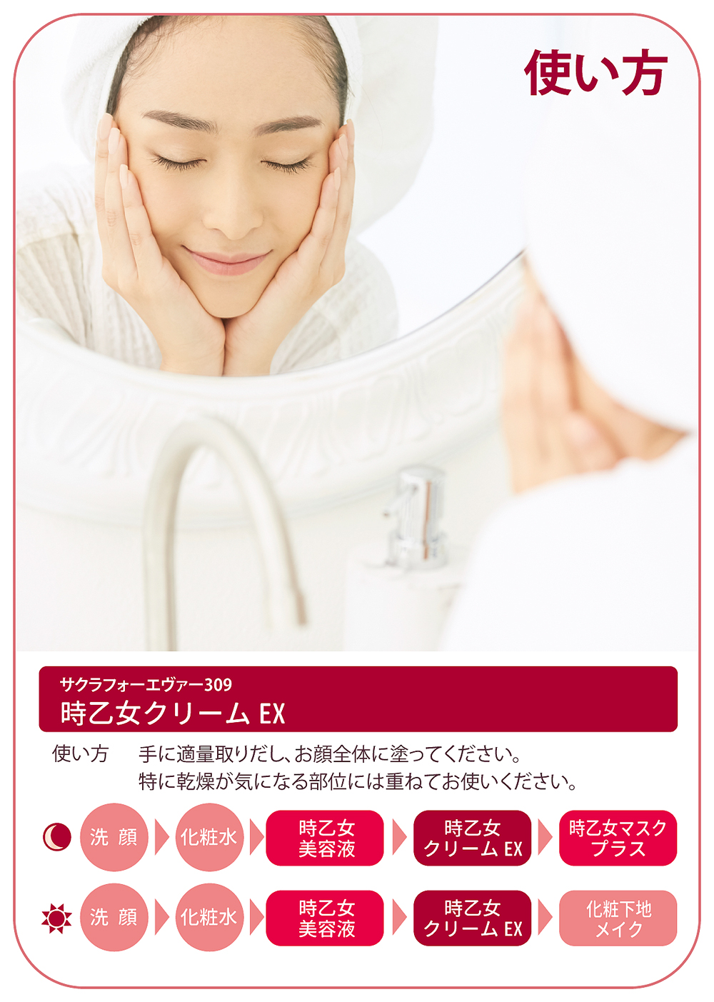 クリームを塗っても乾燥する・・・持続しない・・・ そんな悩みからできた時乙女 クリームEXは、イオン吸着型ヒアルロン3※ によりお肌の潤いを持続させしっかりと包んでくれます。